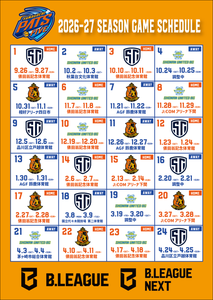 ■B3リーグ B.NEXT 2026-27シーズンの山口パッツファイブ試合日程