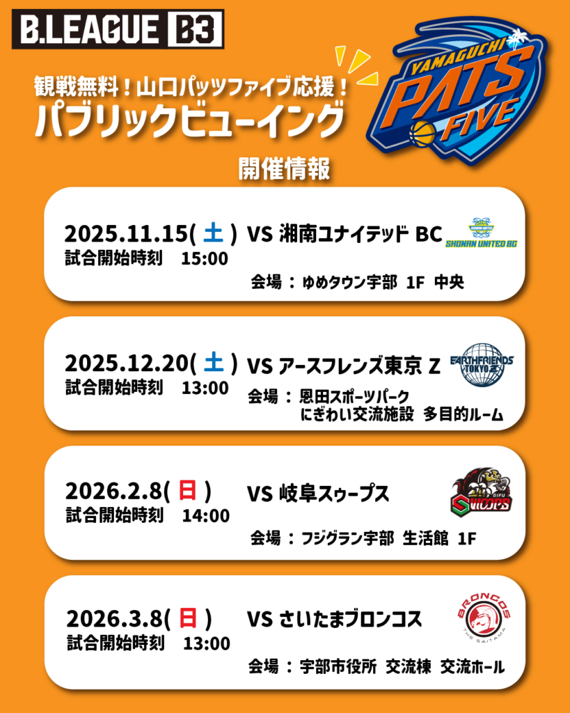 いつも山口パッツファイブを応援いただき誠にありがとうございます。
