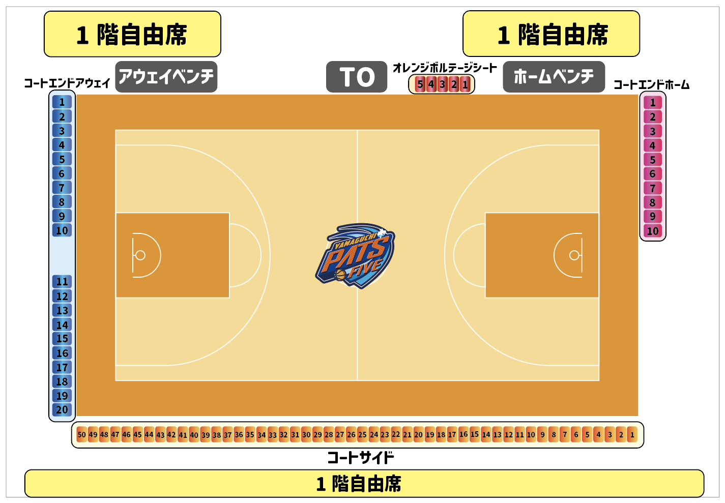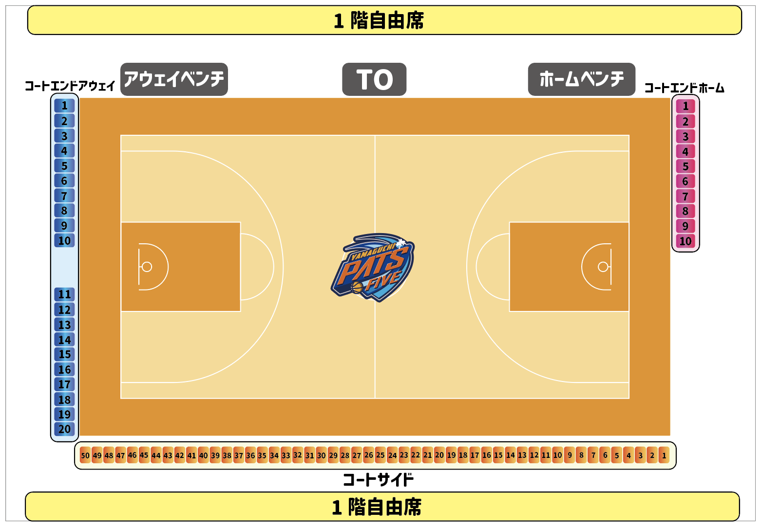ホームベンチは通常TO席から見て左側となりますが、会場・試合に寄って変更する場合もございます。通常と逆の配置となった場合、指定席もそれに伴い反転の配置となります。 車いす席は、1階のみとなります。1階自由席のチケットをお買い求めください。車いす席エリアには、介添えの方1名様のお席もご用意致します。介添えの方もチケットが必要となります。